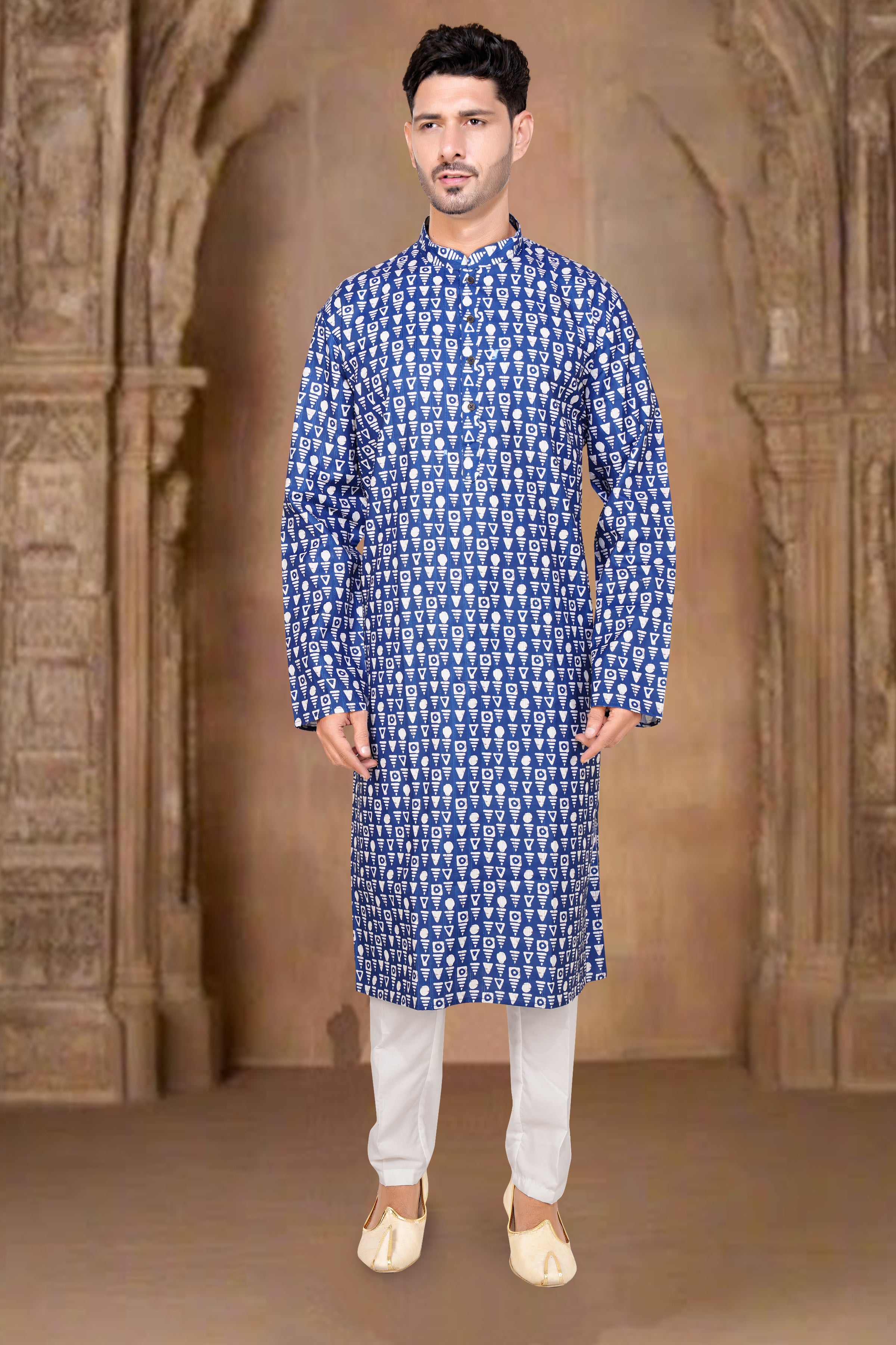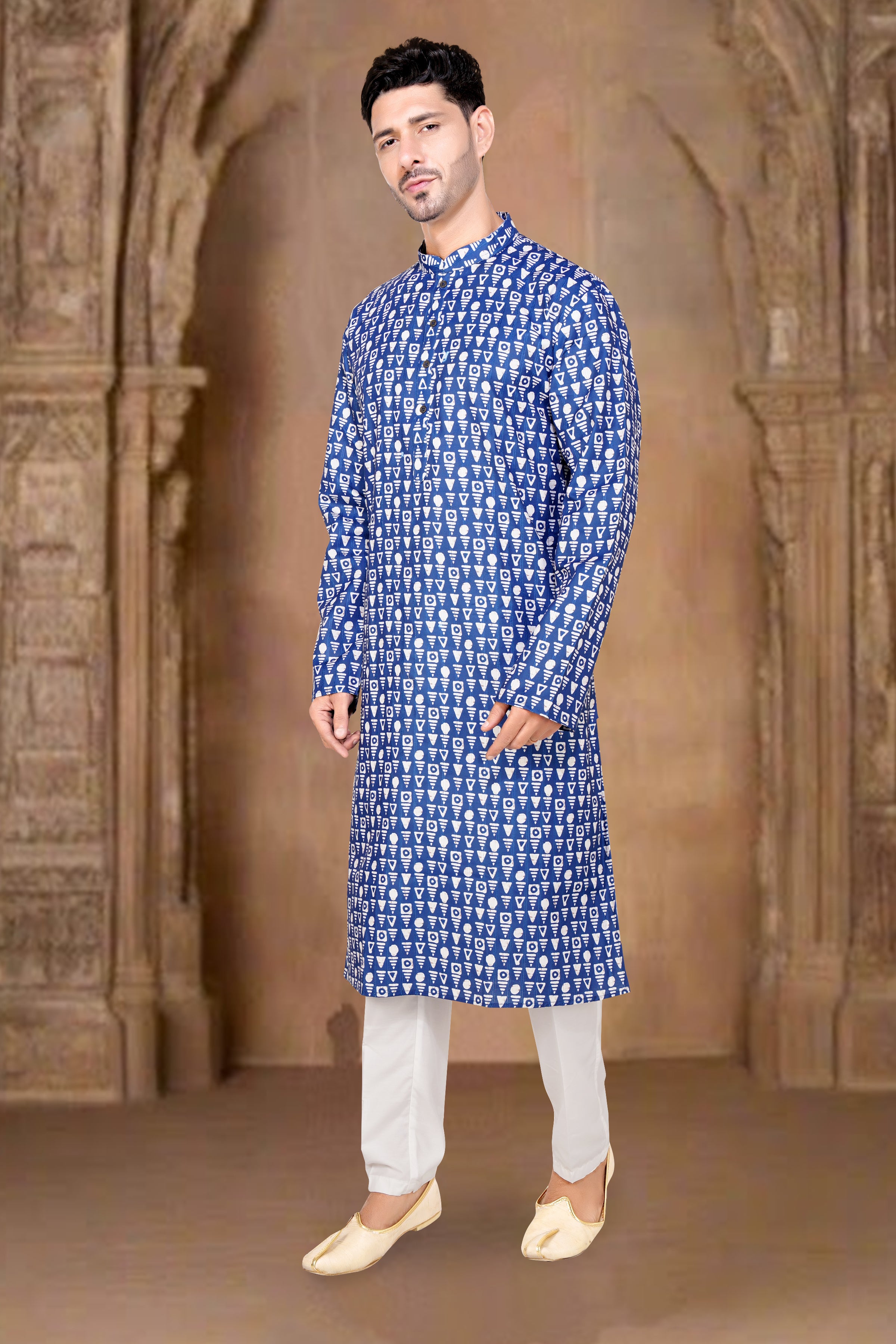 Make a captivating statement with thisClassic gamthi print kurta set. Crafted from premium blended fabric, the kurta features a classic mandarin collar and a clean placket, adorned with an all-over intricate geometric pattern in contrasting white. It is perfectly paired with crisp white tailored pants, offering a classic and contrasting look. Ideal for festive gatherings, cultural events, and celebratory occasions, this ensemble effortlessly blends comfort with distinctive style.