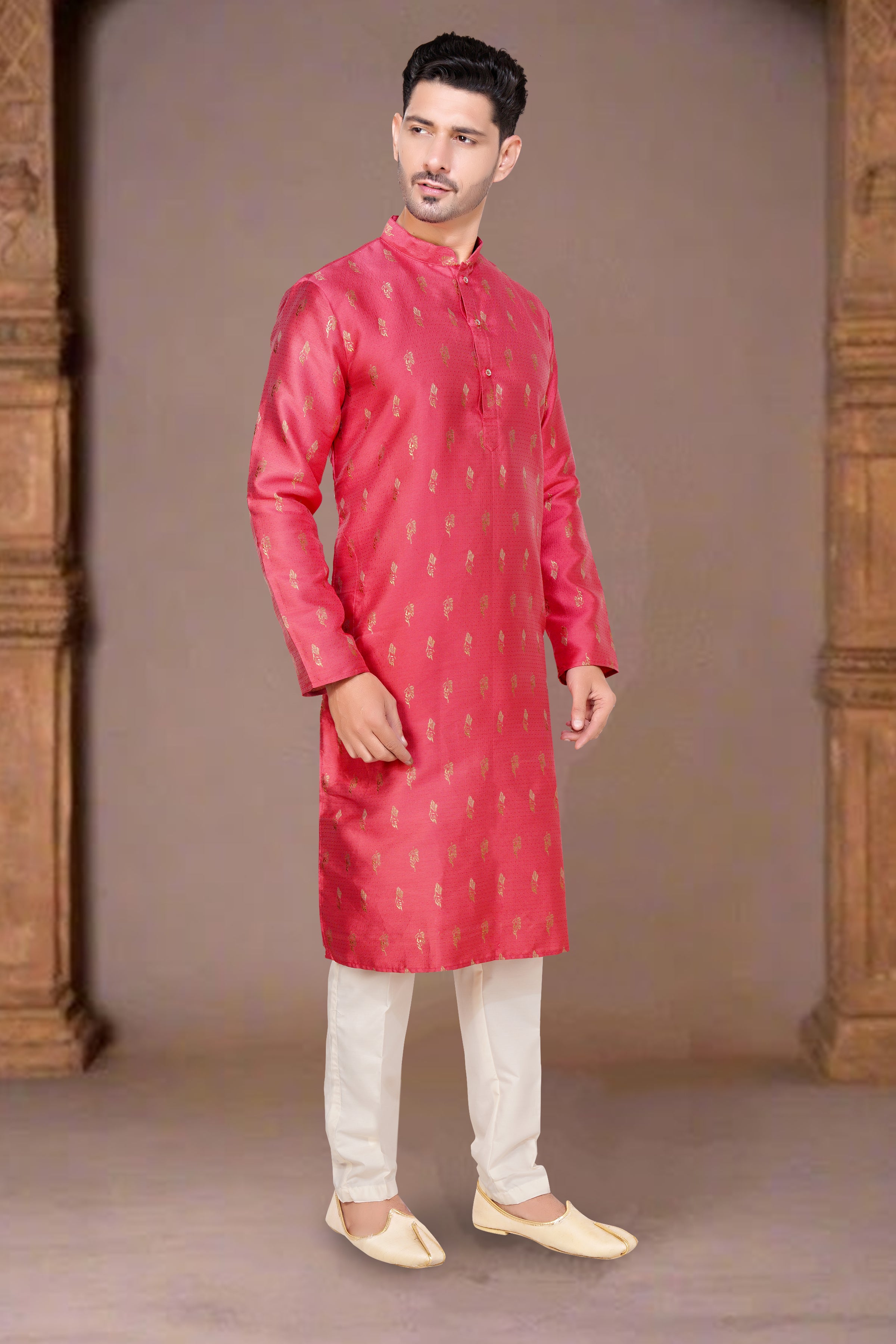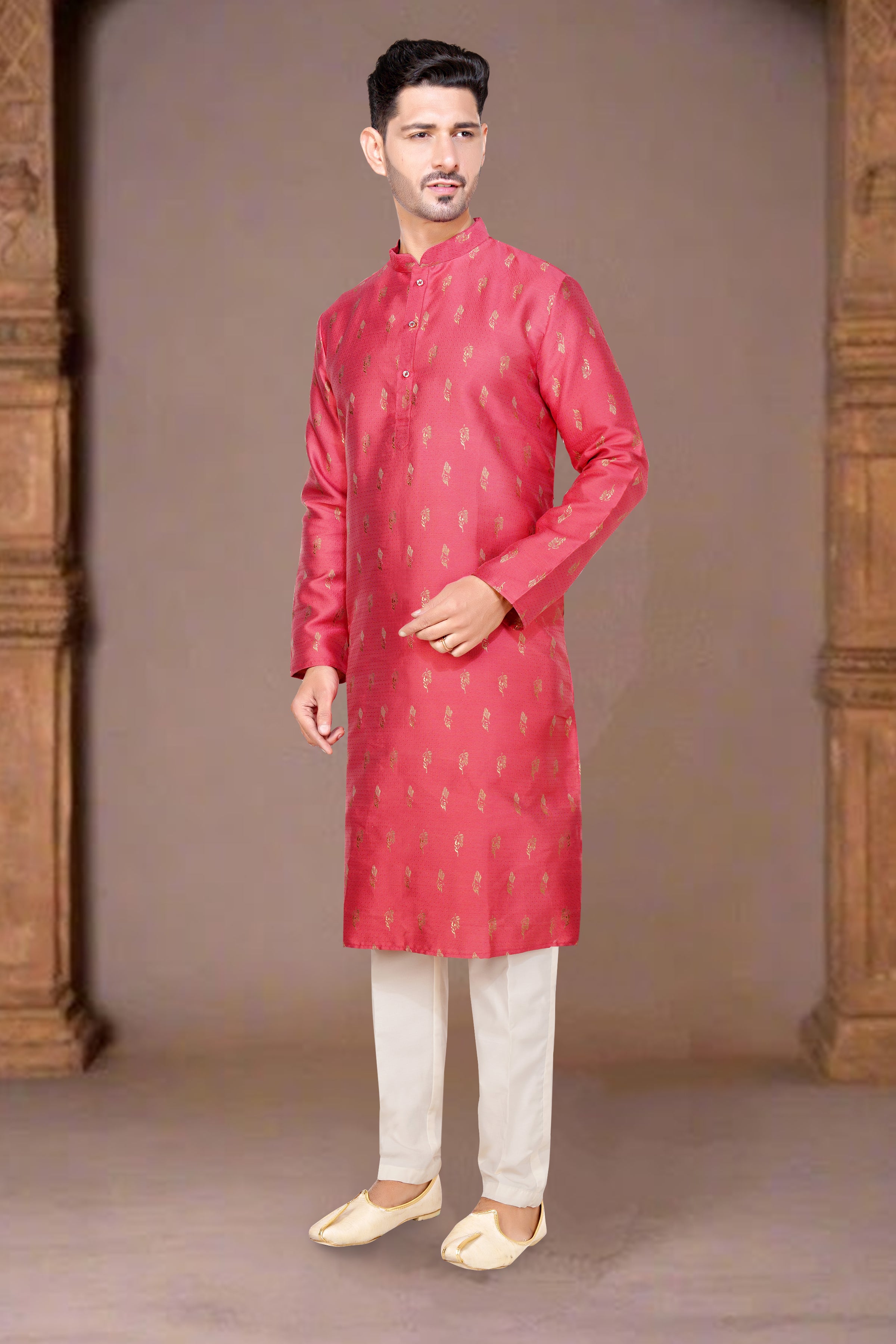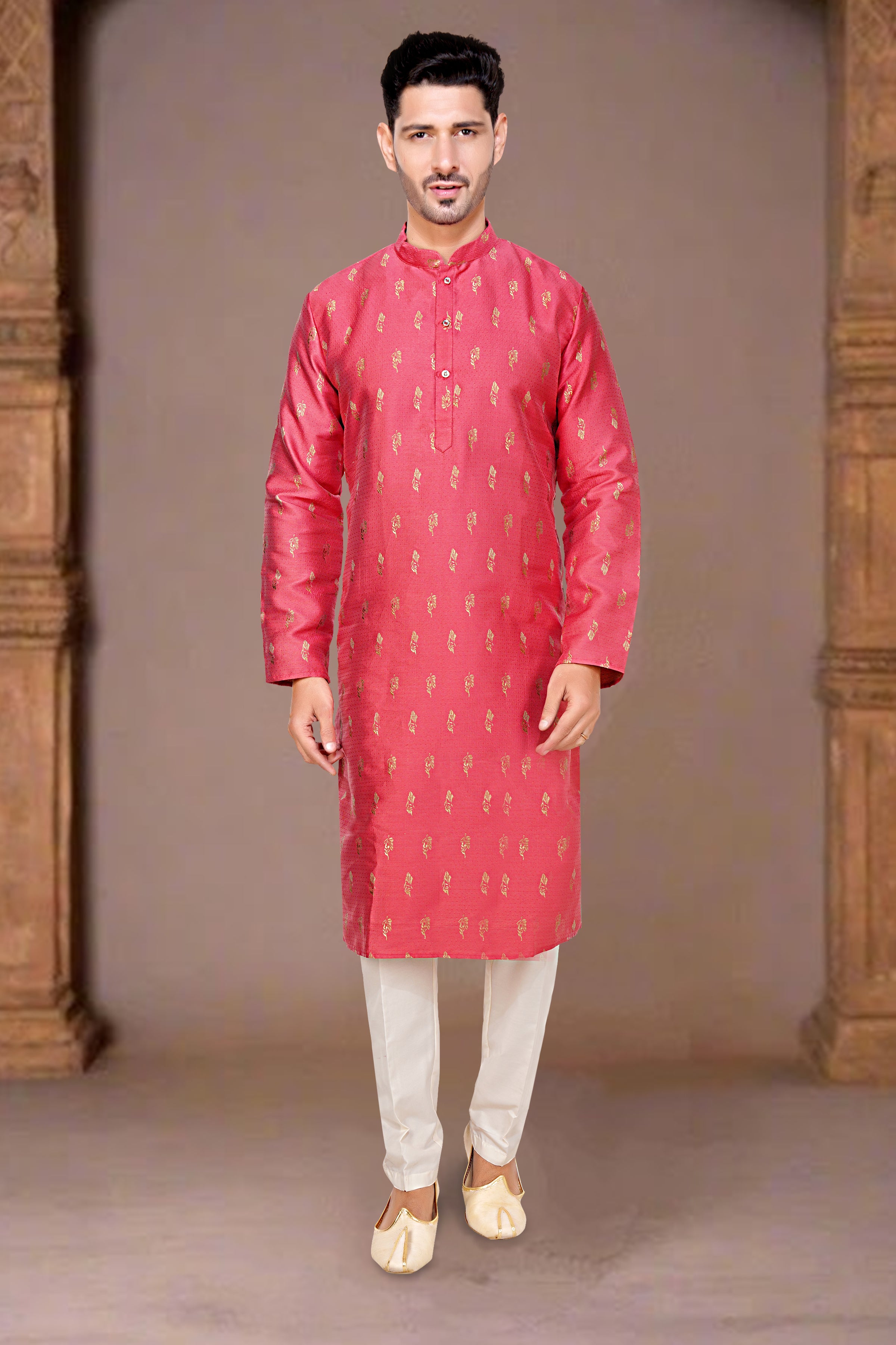 Elevate your festive style with this charming Coral kurta set. Crafted from premium blended fabric, the kurta features a classic mandarin collar and a refined placket, adorned with exquisite gold jacquard woven motifs throughout, adding a touch of traditional richness. It is perfectly paired with comfortable gold tailored pants, creating a balanced and elegant contrast. Ideal for festive occasions, family celebrations, and traditional events, this ensemble offers a graceful yet vibrant presence.