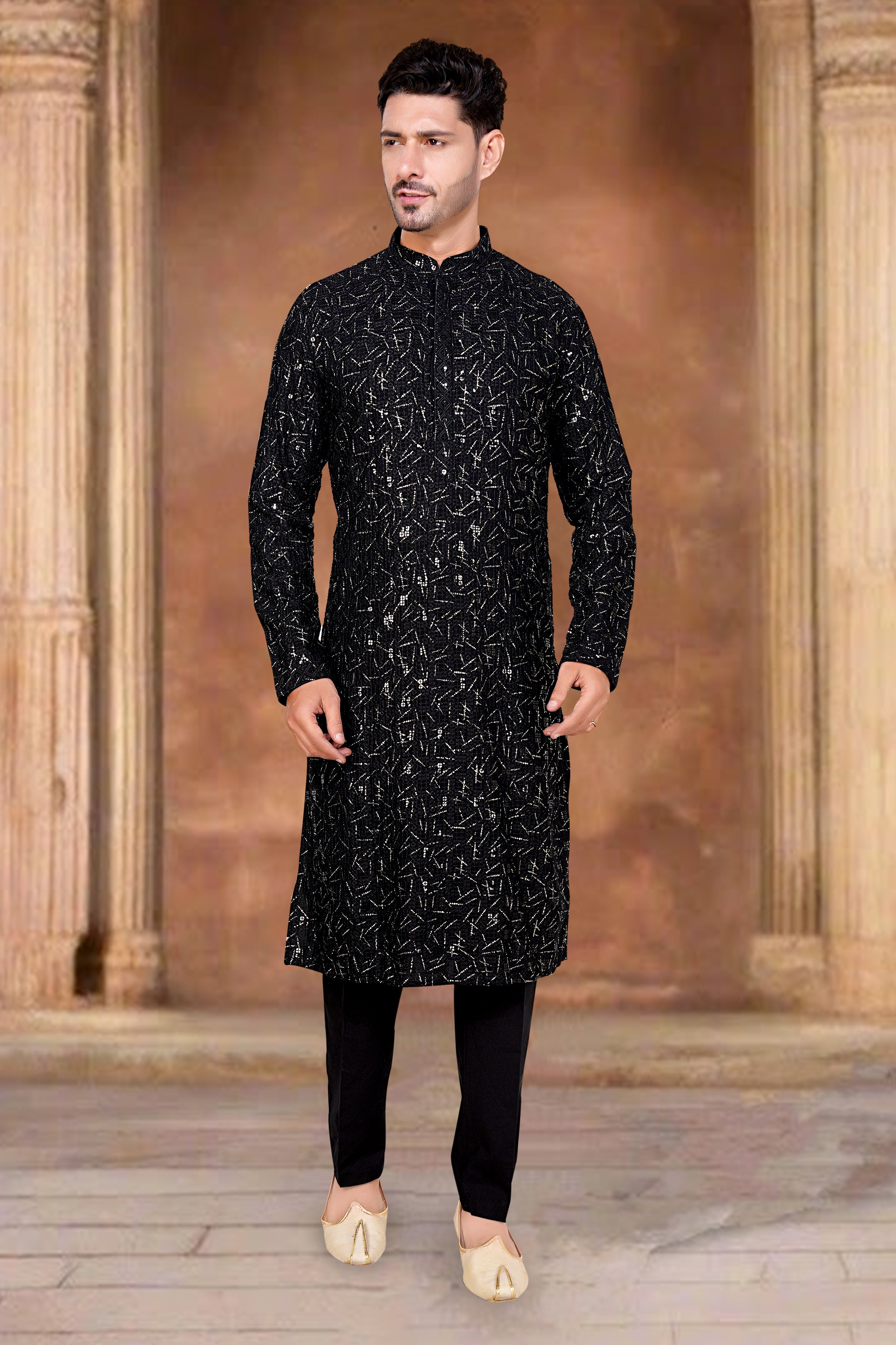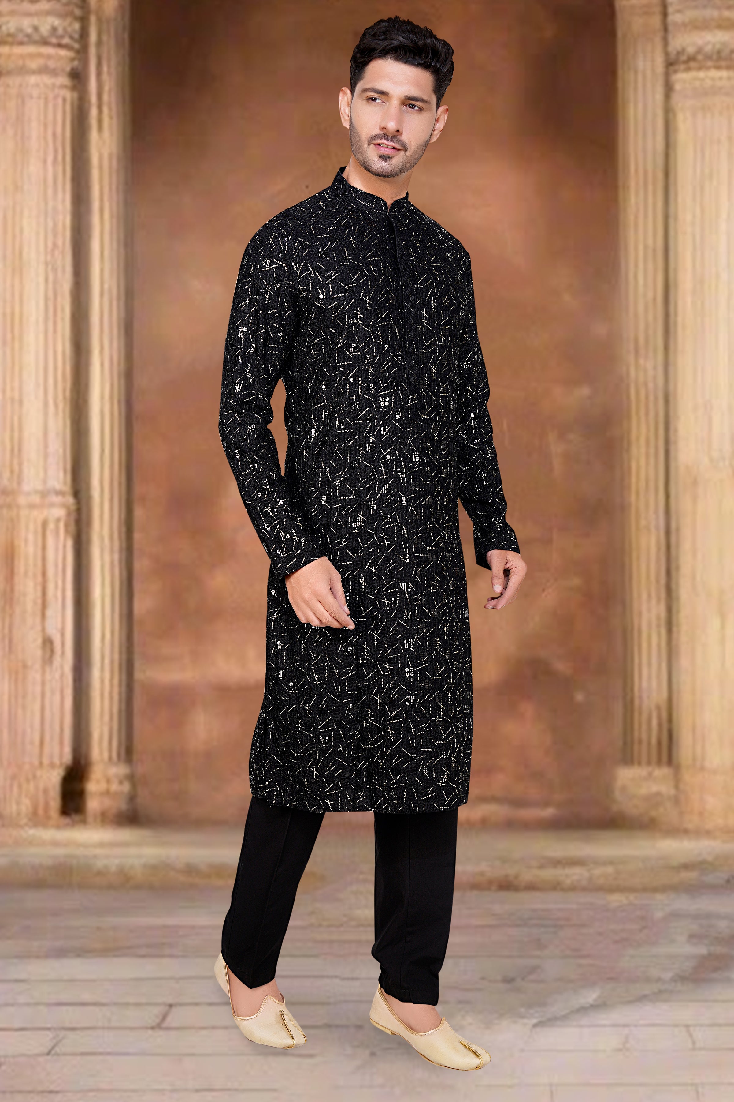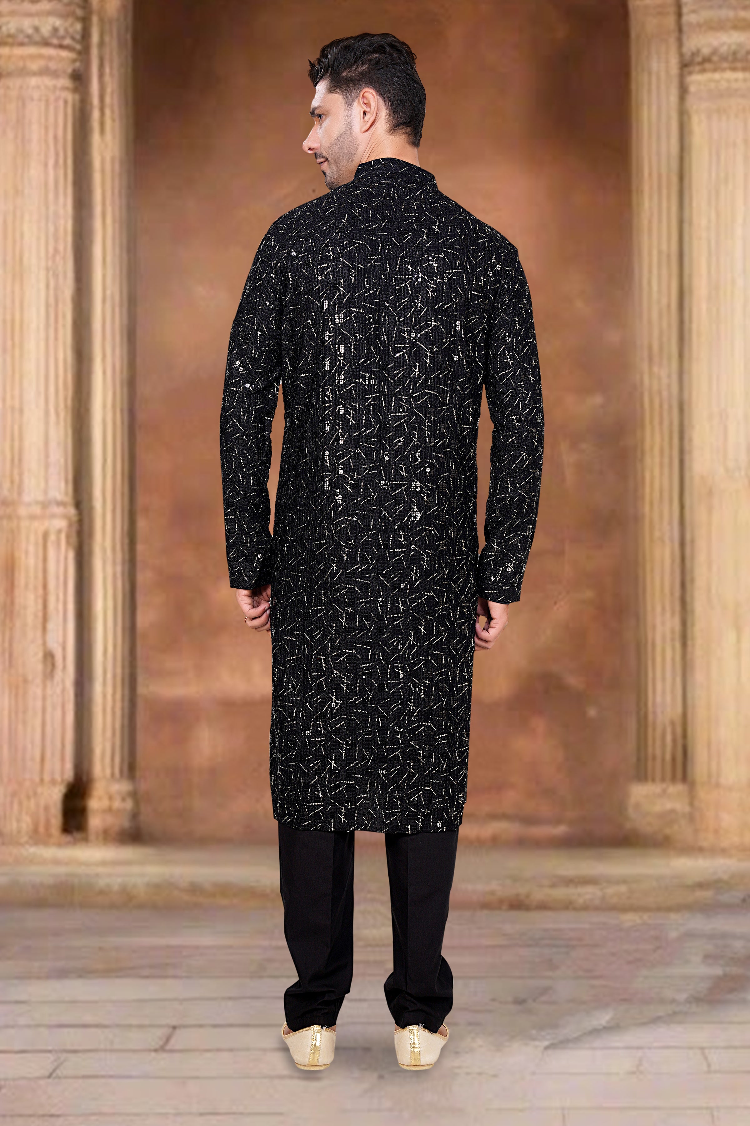 Make a captivating entrance with this dazzling black Chickenkari kurta set. Crafted from premium blended fabric, the kurta features a sophisticated mandarin collar and a refined placket, adorned with intricate sequin embroidery in a modern, abstract pattern that truly stands out. It is impeccably paired with matching tailored pants for a sharp and cohesive look. Ideal for evening receptions, festive celebrations, and grand events, this ensemble effortlessly combines traditional elegance with contemporary design, ensuring a memorable and stylish presence.