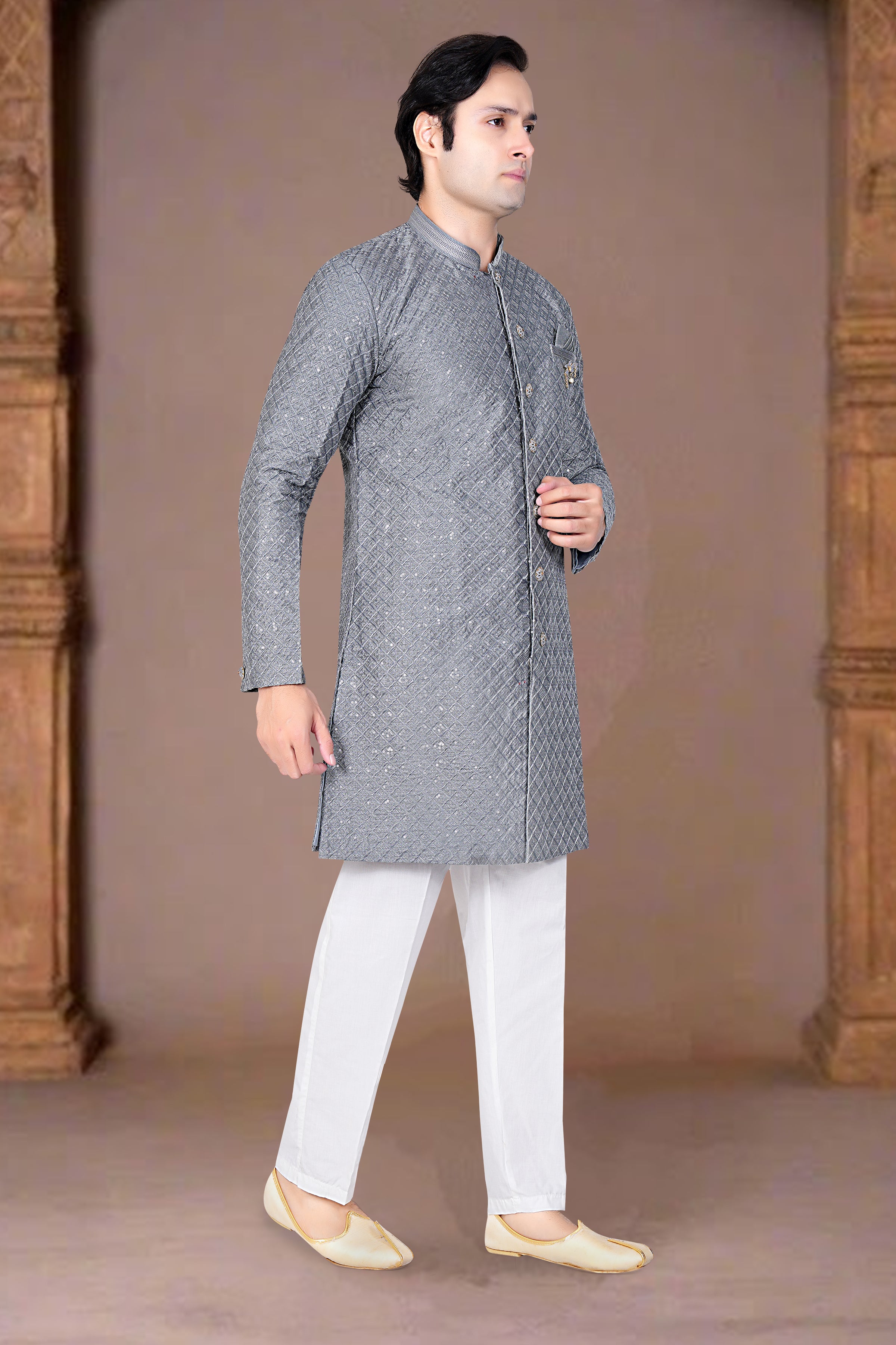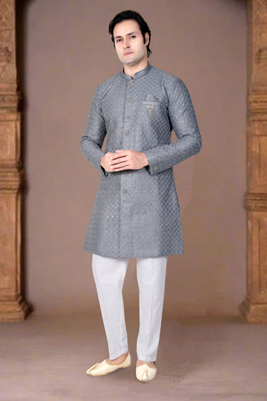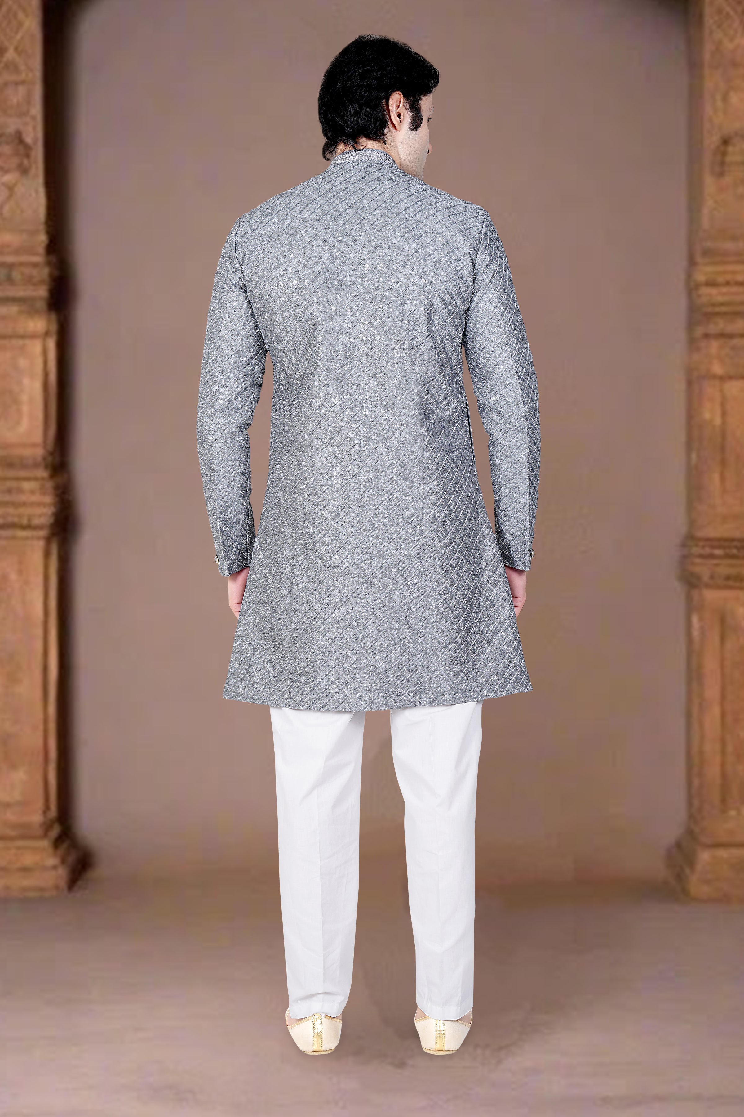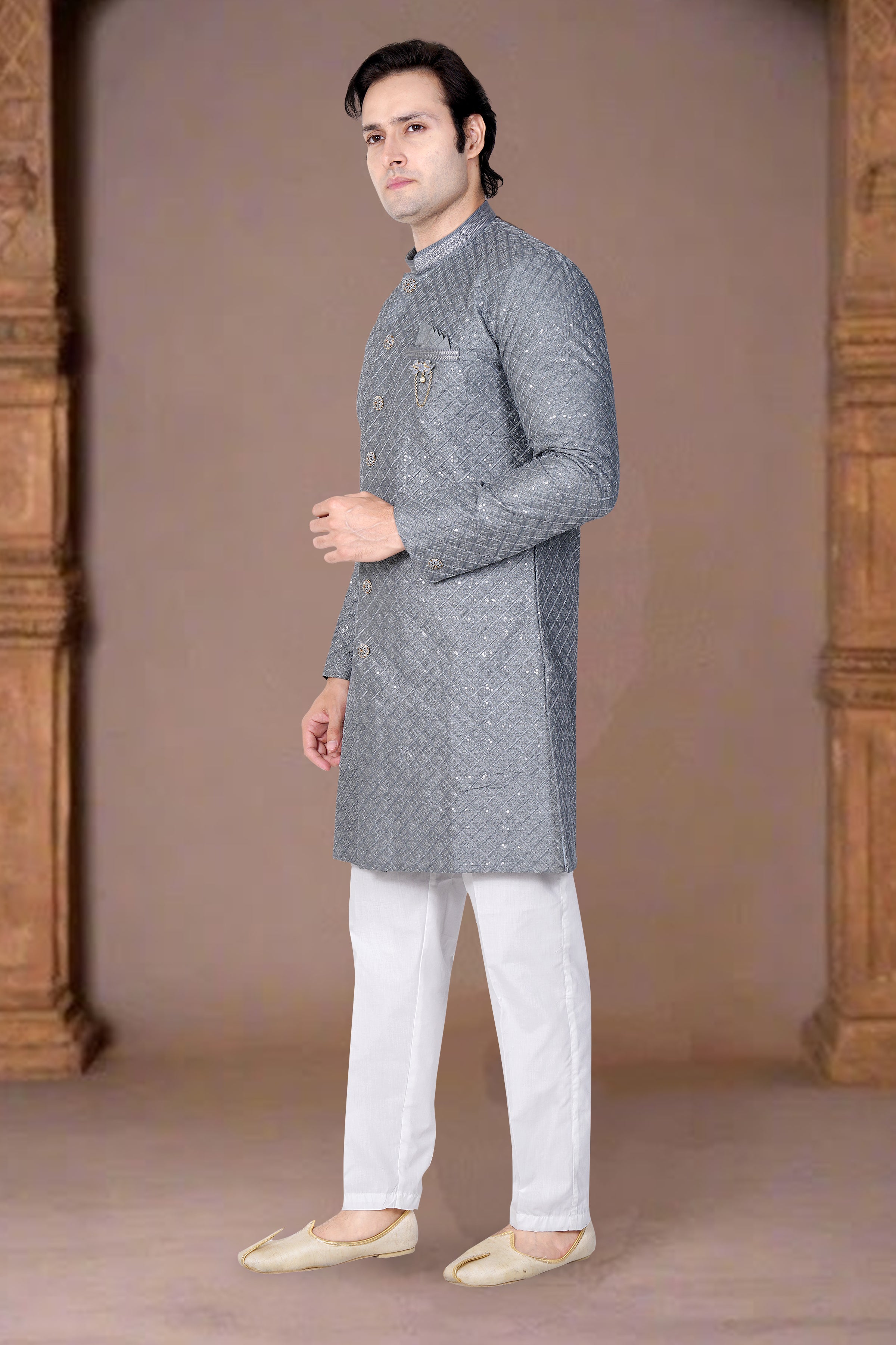 Make a distinguished statement with this exquisite Gray Embroidered Sherwani. Crafted from premium blended fabric, this sherwani features a structured silhouette with a sophisticated mandarin collar and a full button-down placket, adorned with an intricate, self-color embrodiered pattern throughout for a rich, textured look. It is perfectly paired with crisp white tailored pants for a sharp, contrasting, and streamlined appearance. The outfit is further elevated by a stylish pocket square, adding a touch of personalized flair. Ideal for weddings, receptions, and grand celebrations, this ensemble delivers timeless sophistication and modern elegance in equal measure.