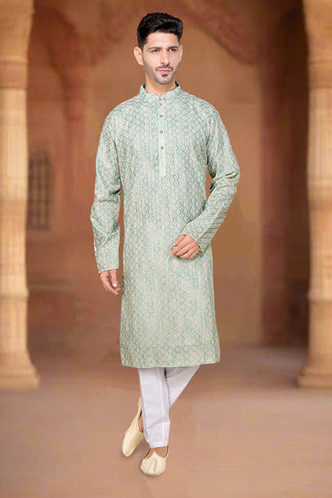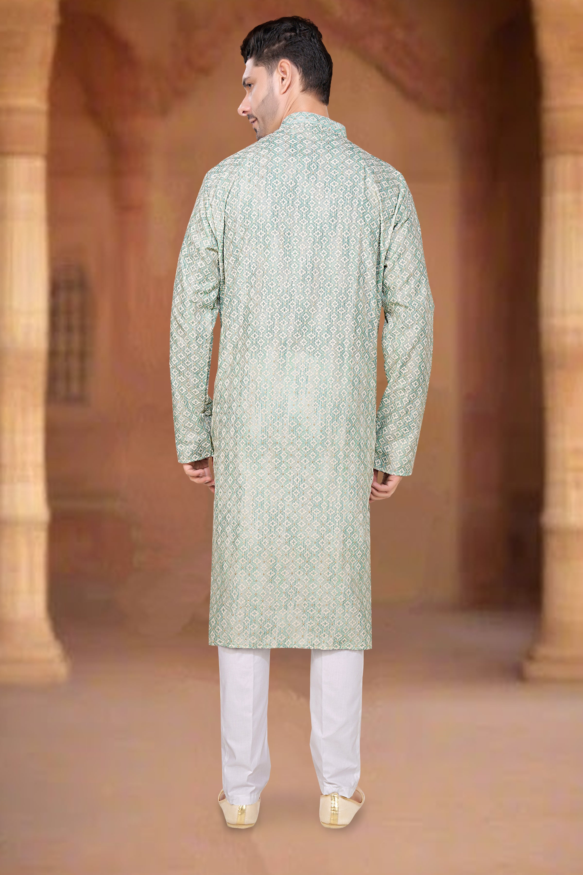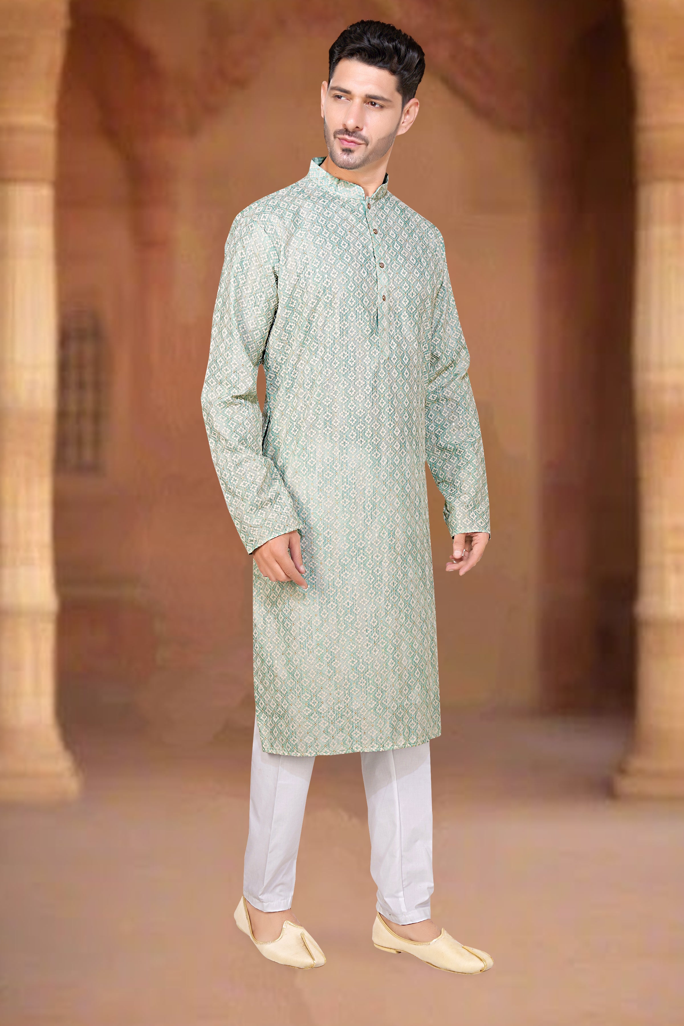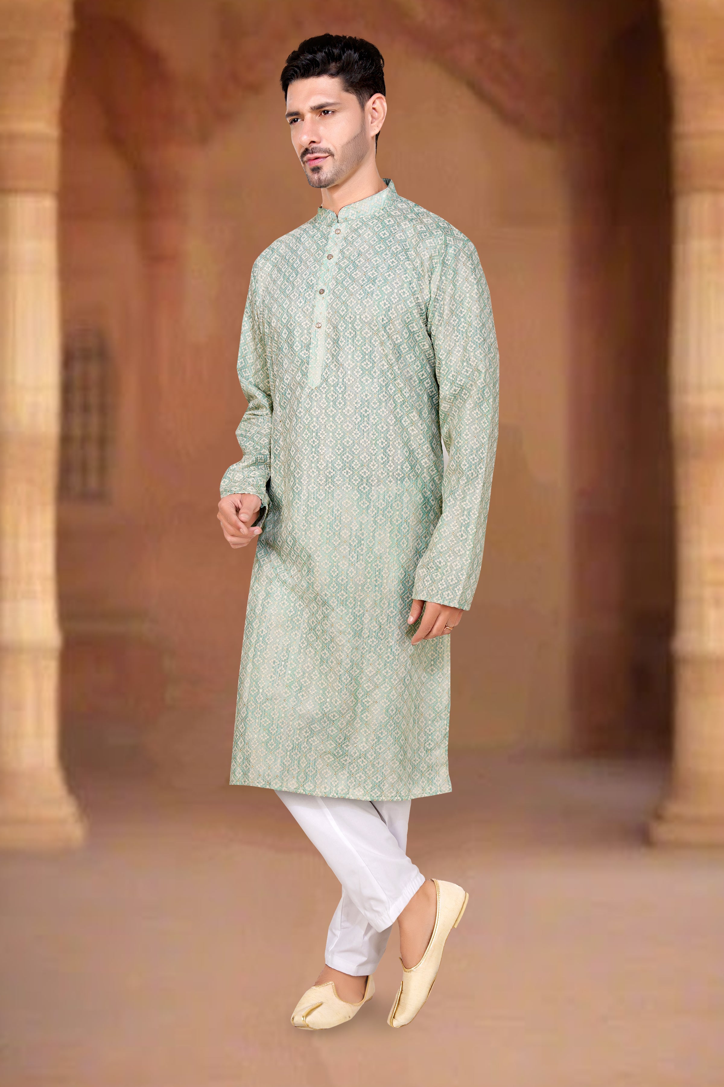 Make a statement with this stylish & Classy Mint green embrodiered kurta set. Crafted from premium silk fabric giving an ombre touch, the kurta features a sophisticated mandarin collar , adorned with an all-over intricate geometric pattern that adds modern appeal. It is perfectly paired with crisp white tailored pants, offering a classic and contrasting look. Ideal for festive gatherings, casual celebrations, and cultural events, this ensemble effortlessly blends traditional comfort with contemporary design, ensuring a smart and distinctive presence.